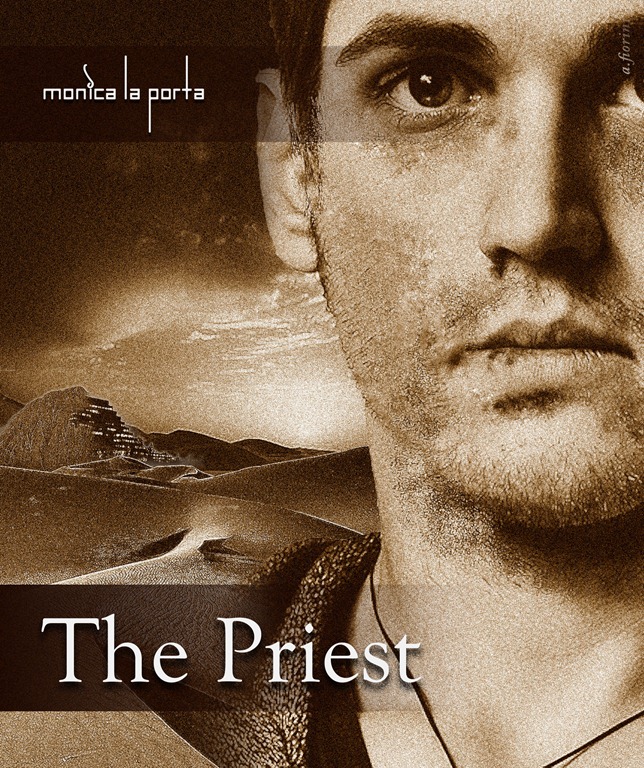 I realized at that point that we were getting definitely closer, but few details were off, and that I needed to give Sandro more information about my work. First my novel’s genre isn’t romance or fantasy, but a combination of alternate reality and love story. The drawing style would be perfect for a fantasy cover, but it gives the wrong impression for The Priest’s modern day setting. Ginecean technology is similar to ours, so the futuristic jet was out of place. The City of the Men looks like a natural pyramid from the outside. Finally, the main character is a man, the slave Mauricio. I liked the idea of having a close up of the face, and the landscape as the background.