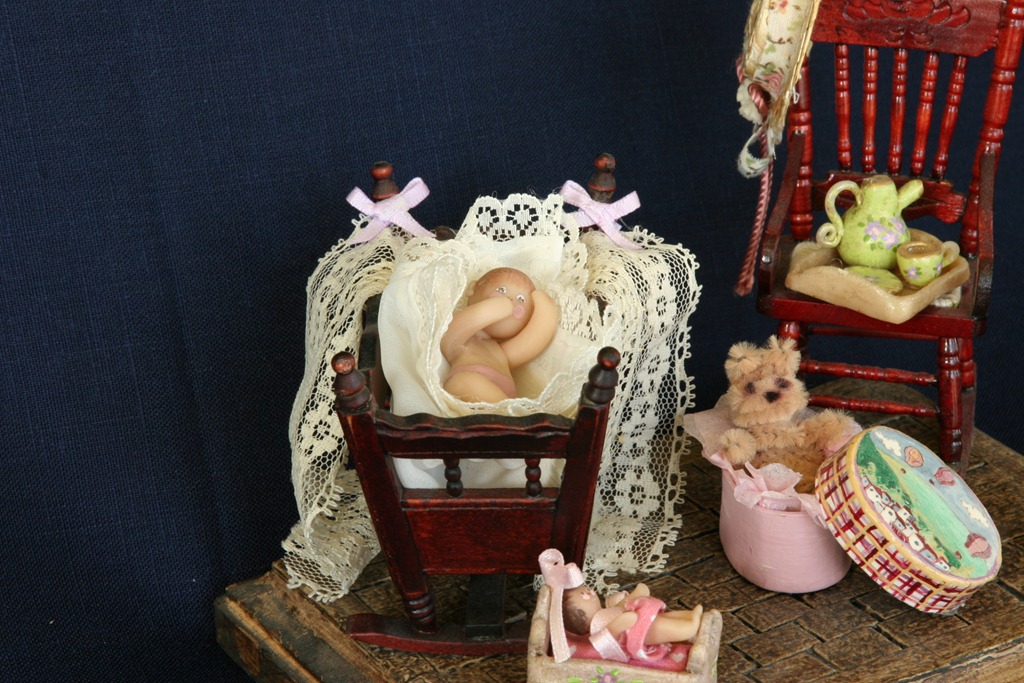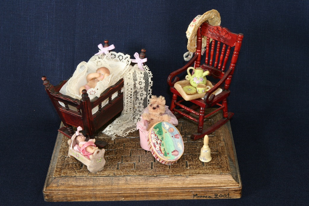I made the tiled floor by cutting rectangular pieces from an egg container. I glued them on the wooden platform, filled the gaps between tiles with a paste made of flour and Elmer’s glue, and then painted all over with a mixture of brown and black acrylic colors. I removed some of the painting with a cloth to create the distressed look, and finally I sprayed the floor with two layers of a glossy finish. I used white Fimo to create the tea set resting on the rocking chair, painted it with acrylic colors, and sealed it with a glossy finish. I used skin-color Fimo for the baby girl sleeping inside the crib, and also for the doll and the doll’s crib. A special crackling finish was used to give the doll’s crib the antique texture. I made the toy bear with a brown cleaning pipe and painted the nose and the eyes. I painted the landscape on the toy box with acrylics and finished it with a watercolor sealer.
