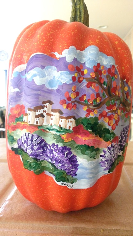 When I first moved to the United States, twelve years ago—can’t believe it has been so long already—I was exposed to the American art of pumpkin carving and decorating. Once I painted my first pumpkin, I realized I didn’t want for it to go to waste and be forgotten. So I started buying foam pumpkins to paint them with acrylics. Since then, every fall I paint at least one pumpkin—usually around three or four. Now, I have quiet a collection lying around the house all year long. Here are a few pictures of some of my special pumpkins.