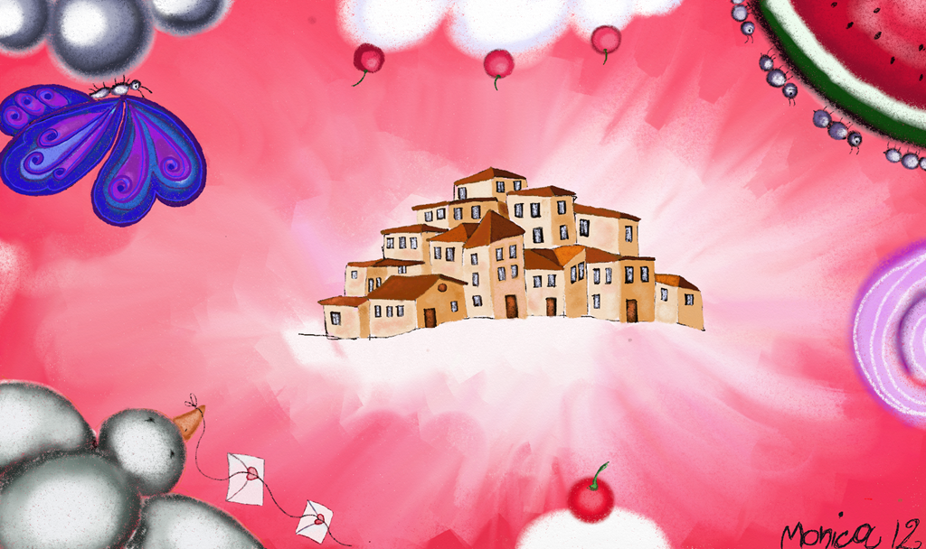 A friend of mine, C. B., is a wonderful artist. A few days ago, she posted on Facebook her latest painting, a colorful village by the sea, and I was inspired by it. Earlier this morning, still jetlagged, I opened Fresh Paint and created this piece.