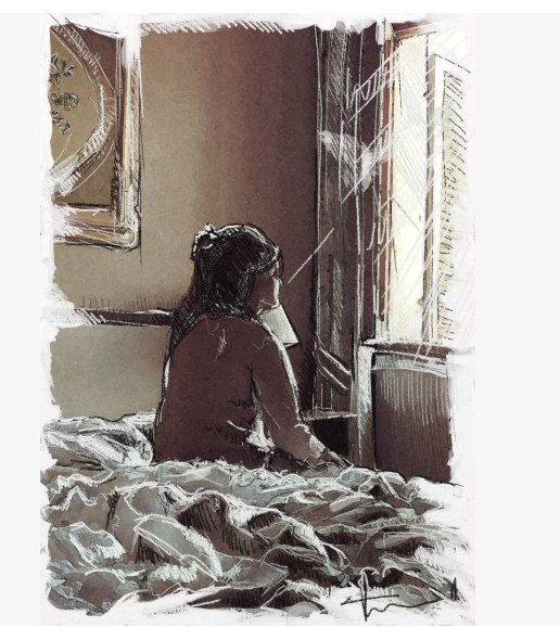 He’s coming. The sheets lie crumpled at her side as a sea of stormy thoughts. The perfume she had carefully donned is wafting away. Nearby, a gate opens and closes, rusted hinges breaking the morning silence.